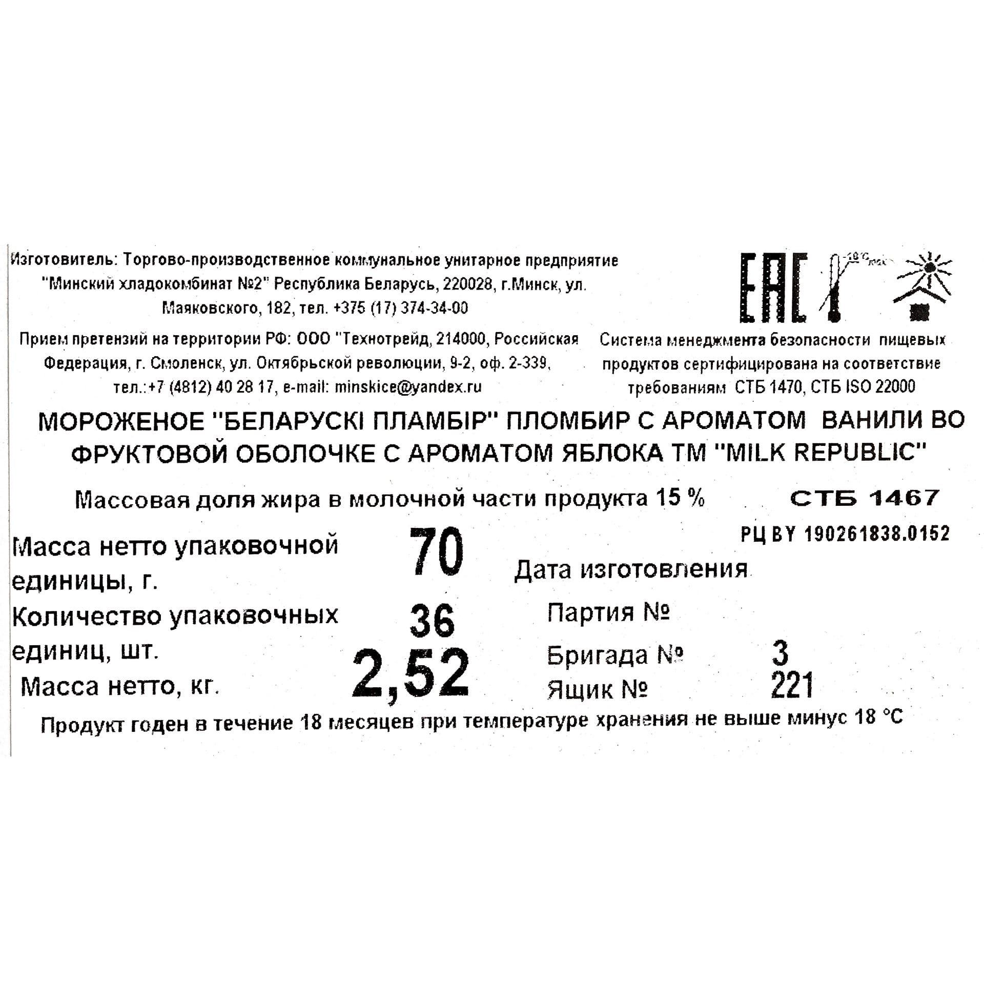Мороженое пломбир в яблочной оболочке на палочке Беларускi пламбiр 70 г 9785LED